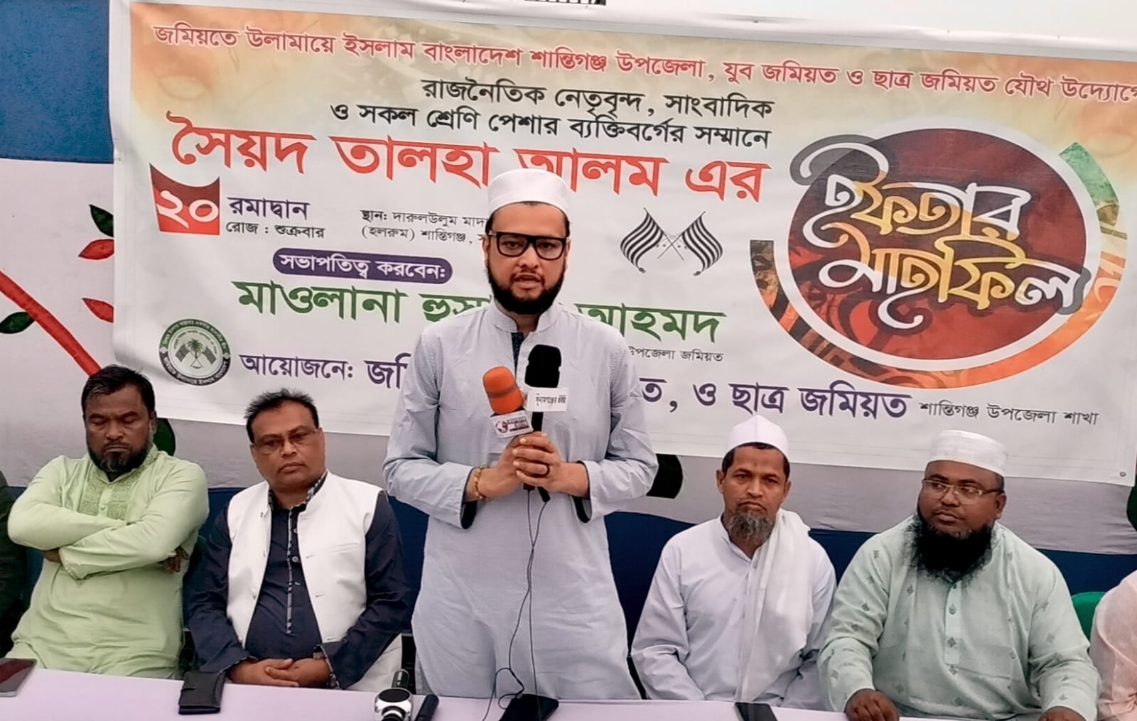 শুক্রবার(২১ মার্চ) উপজেলা জমিয়ত, যুব জমিয়ত ও ছাত্র জমিয়তের যৌথ আয়োজনে শান্তিগঞ্জস্থ মাদানিয়া মাদ্রাসার প্রাঙ্গনে অনুষ্ঠিত এই ইফতার মাহফিলে প্রধান অতিথির বক্তব্য রাখেন আসন্ন জাতীয় সংসদ নির্বাচনে সুনামগঞ্জ-৩ আসনে জমিয়ত মনোনীত সংসদ সদস্য পদপ্রার্থী ও কেন্দ্রীয় জমিয়তের প্রচার সম্পাদক সৈয়দ তালহা আলম।