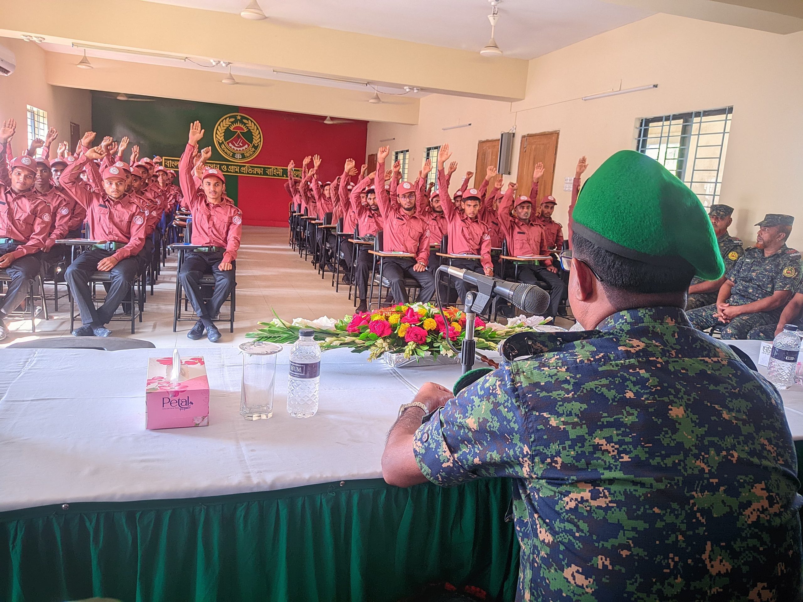 প্রধান অতিথির বক্তব্যে তিনি প্রশিক্ষণার্থীদের সততা, নিষ্ঠা ও পরিশ্রমের মাধ্যমে নিজেদেরকে যোগ্য ও দক্ষ সুনাগরিক হিসেবে গড়ে তোলার আহ্বান জানান। এছাড়াও তিনি প্রশিক্ষণের মূল লক্ষ্য ও উদ্দেশ্য অর্জনে মনোনিবেশ করার জন্য সকলকে অনুপ্রাণিত করেন। তিনি প্রশিক্ষণার্থীদেরকে বাহিনীর সাংগঠনিক কাঠামো, প্রাসঙ্গিক আইন-কানুন ও অস্ত্র পরিচালনা এর মতো গুরুত্বপূর্ণ মডিউলগুলো দৃঢ়তা, প্রজ্ঞা ও অধ্যবসায়ের সাথে আত্মস্থ করার পরামর্শ দেন, যাতে ভবিষ্যতে এই প্রশিক্ষণলব্ধ জ্ঞান দেশ ও জনগণের সেবায় কাজে লাগানো যায়।