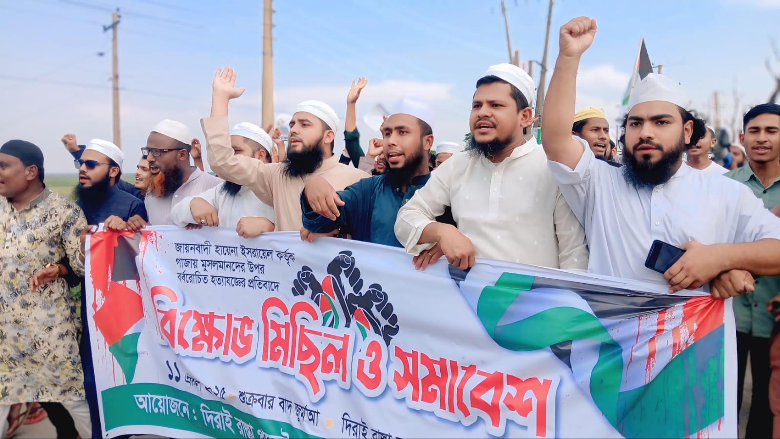ইসরাইলি হত্যা বন্ধ ও স্বাধীন ফিলিস্তিন রাষ্ট্র প্রতিষ্ঠার দাবিতে এতে স্থানীয় জনগণ, মুসল্লি, শিক্ষার্থী, ব্যবসায়ী ও শ্রমজীবী সাধারণ মানুষ অংশ গ্রহণ করেন।