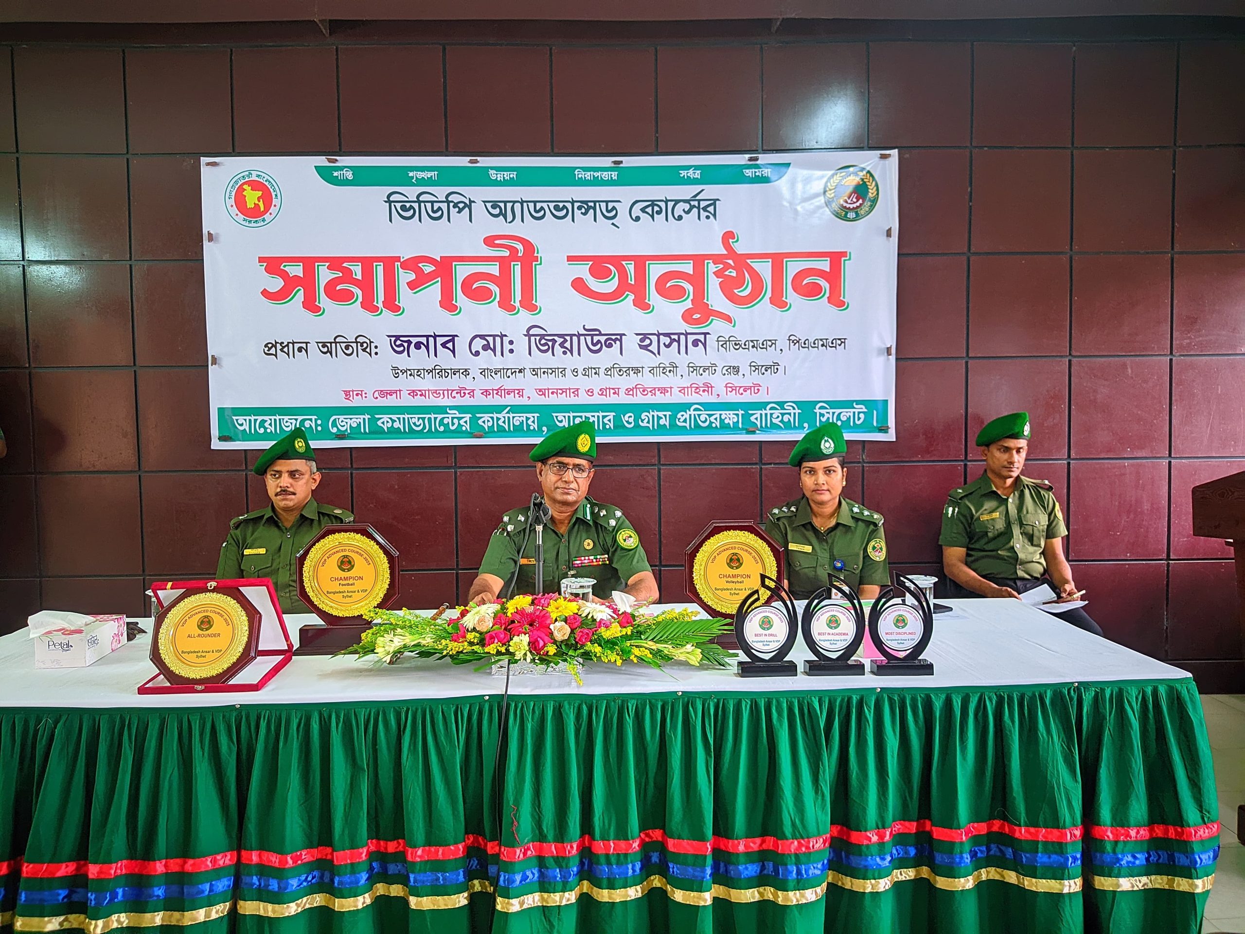 ৬ই মে ২০২৫ ইং তারিখে সিলেট জেলায় আনসার ও গ্রাম প্রতিরক্ষা বাহিনীর (ভিডিপি) অ্যাডভান্সড প্রশিক্ষণ কোর্সের সমাপনী অনুষ্ঠান অনুষ্ঠিত হয়। এ প্রশিক্ষণে সিলেট জেলার ১৩ টি উপজেলা হতে আগত ৮৪ জন প্রশিক্ষণার্থী অংশগ্রহণ করেন। এতে প্রধান অতিথি হিসেবে উপস্থিত ছিলেন আনসার ও ভিডিপি সিলেট রেঞ্জের উপমহাপরিচালক মো: জিয়াউল হাসান বিভিএমএস, পিএএমএস ।