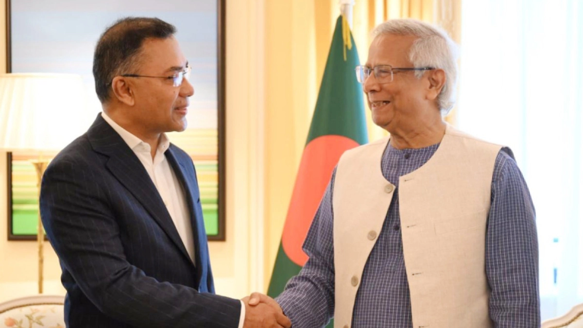 প্রধান উপদেষ্টা মুহাম্মদ ইউনূসের সঙ্গে করমর্দন করেন বিএনপির ভারপ্রাপ্ত চেয়ারম্যান তারেক রহমান। ছবি-সংগৃহীত
