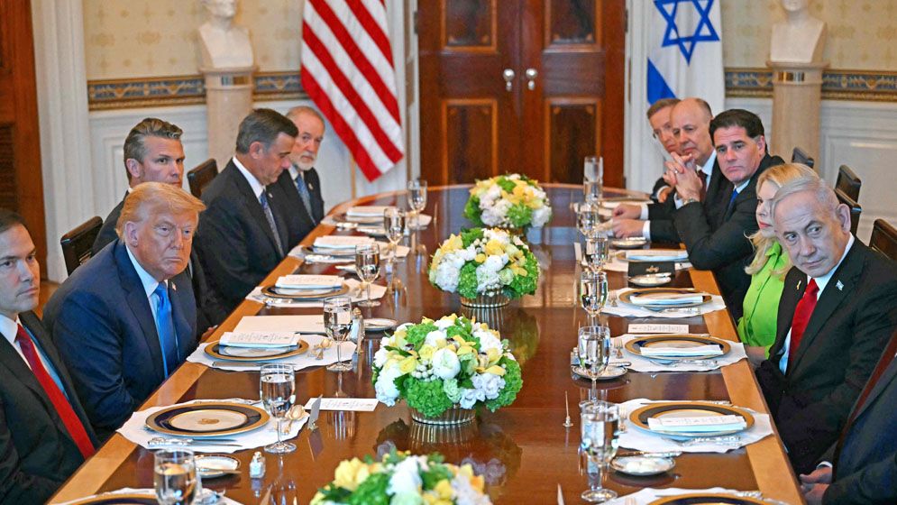 হোয়াইট হাউসের ব্লু রুমে নৈশভোজে ডোনাল্ড ট্রাম্প ও বেনিয়ামিন নেতানিয়াহুর সঙ্গে দুদেশের কর্মকর্তারা। ছবি: এএফপি