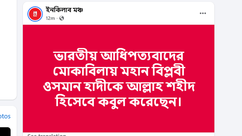 বৃহস্পতিবার (১৮ ডিসেম্বর) দিবাগত রাতে বিষয়টি নিশ্চিত করেছে ইনকিলাব মঞ্চ। রাত ৯টা ৪৬ মিনিটে এক ফেসবুক পোস্টে ইনকিলাব মঞ্চ জানায়, ‘ভারতীয় আধিপত্যবাদের মোকাবিলায় মহান বিপ্লবী ওসমান হাদীকে আল্লাহ শহীদ হিসেবে কবুল করেছেন।’